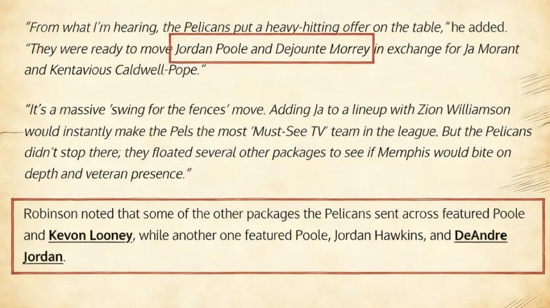 第一套方案为,鹈鹕送出卢尼、普尔、霍金斯以及小乔丹,换取莫兰特。